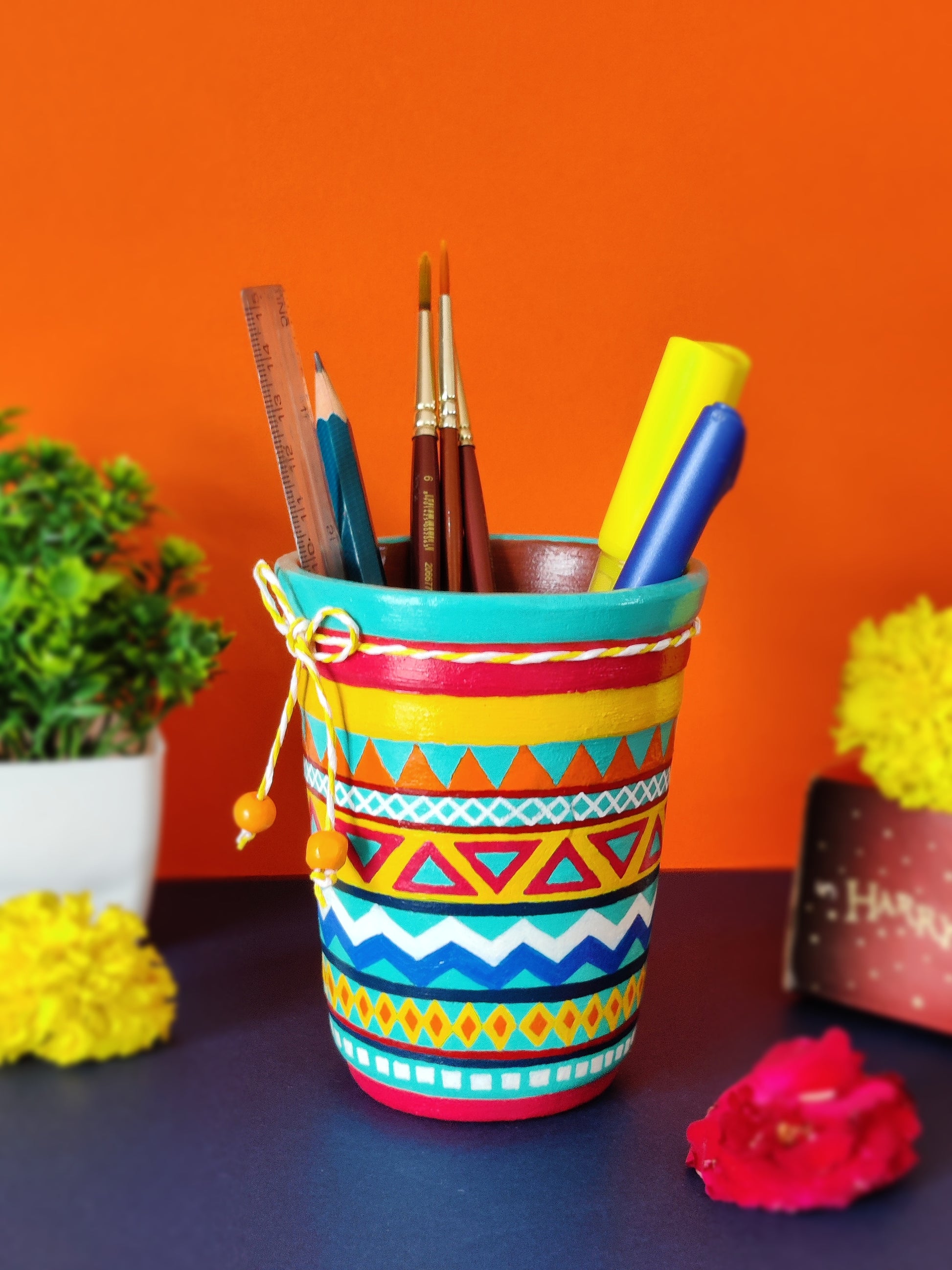 Our product, a Terracotta Pen Stand is the perfect blend of functionality and aesthetics, bringing a burst of color and creativity to your workspace.